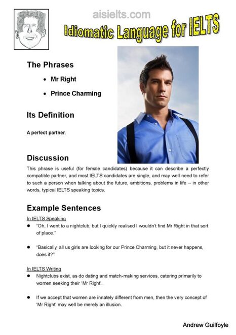 Do not use idiomatic terms which are too dependent on a single individual attitude – for example, ‘my cup of tea’. Idiomatic language works better in formal writing when it can be applied more generally – for example, ‘Mr Right’ [‘Women generally still seek their ‘Mr Right’, but it may be only an idealistic illusion’).